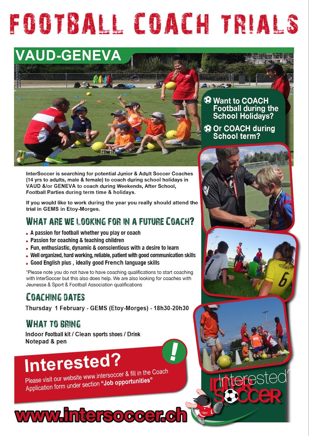 InterSoccer is searching for potential Junior & Adult Soccer Coaches (14 years to adults, male & female) to coach during school holidays in Vaud & /or to coach during Weekends, After School, Football Parties during term time .