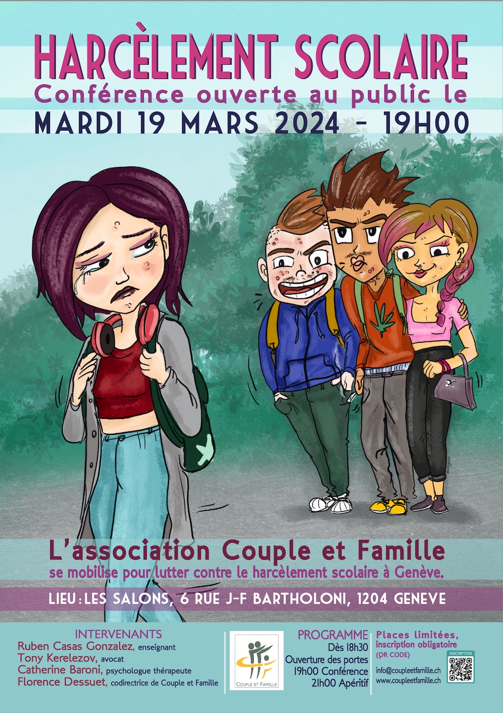 French below (meeting is held in French) Today, the problem of bullying is no longer taboo. We are all, at some point, directly or indirectly, confronted with this reality, whether as parents, teachers, supervisors, educators... We find ourselves powerless in the face of the suffering of children who are victims. The Couple et Famille association is mobilizing to fight this scourge, by offering a new service to help victims and their families in Geneva. We are delighted to invite you to our project presentation conference on Tuesday, 19 March 2024 at 7pm It's free, but please register as places are limited. Aujourd’hui, le problème du harcèlement scolaire n’est plus tabou. Nous sommes tous, à un moment donné, directement ou indirectement, confrontés à cette réalité, soit en tant que parent, enseignant, encadrant, éducateur… Nous nous trouvons démunis face à la souffrance des enfants victimes. L’association Couple et Famille se mobilise pour lutter contre ce fléau, en proposant une nouvelle prestation pour aider les victimes et leurs familles à Genève. Découvrez aussi notre nouveau site internet coupleetfamille.ch qui vous présente cette nouvelle prestation et toutes les autres. Nous sommes heureux de vous inviter à la conférence de présentation de notre projet le mardi 19 mars à 19h C’est gratuit, inscrivez-vous car les places sont limitées.