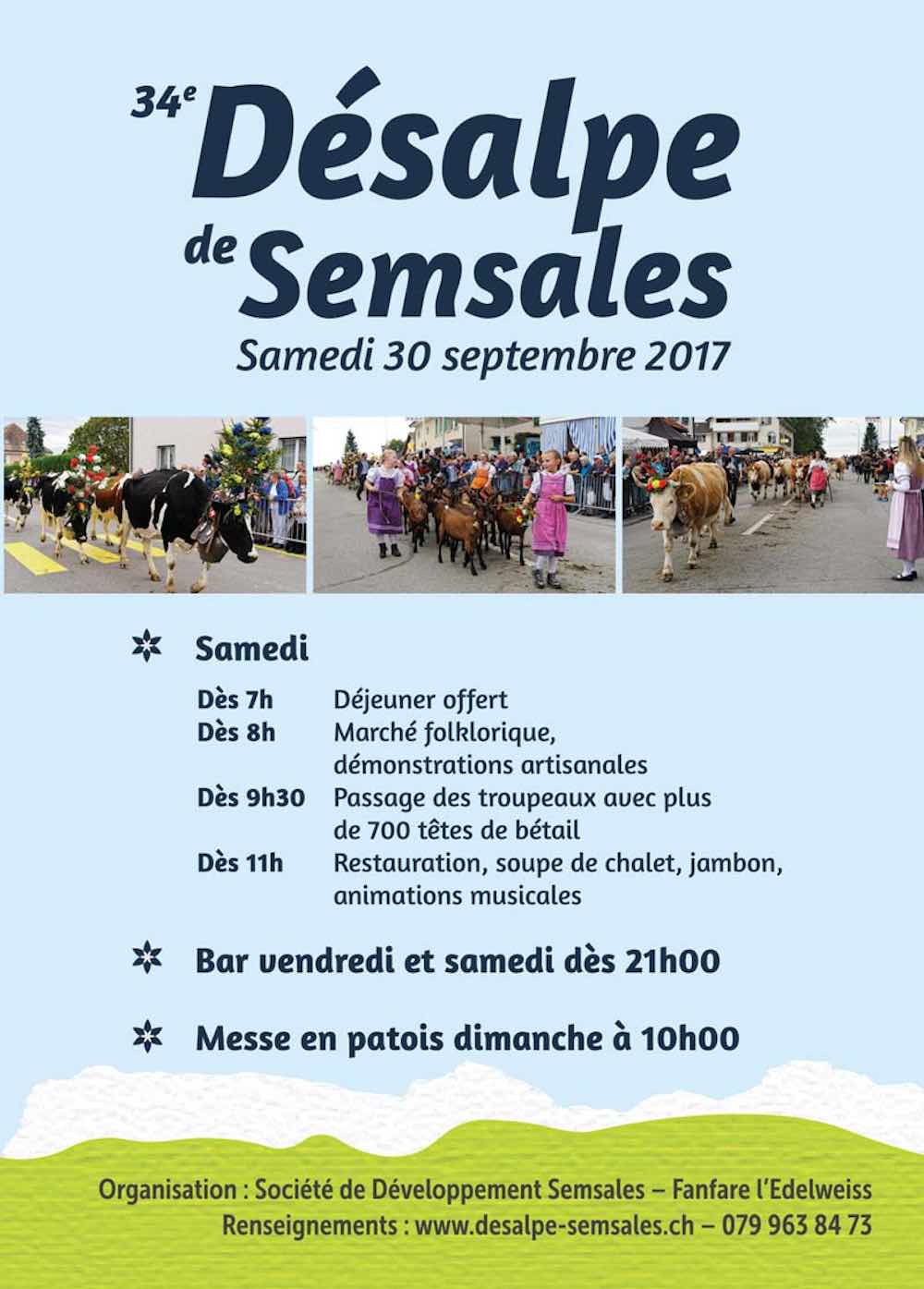 "Désalpe" is the best-known of all traditional mountain festivities. After more than four months of grazing in alpine pastures, cows make their way down to the plain. Program from 7am: parade, traditional music and selling of local products among other things. Saturday, 30 September, 2017 http://www.desalpe-semsales.ch