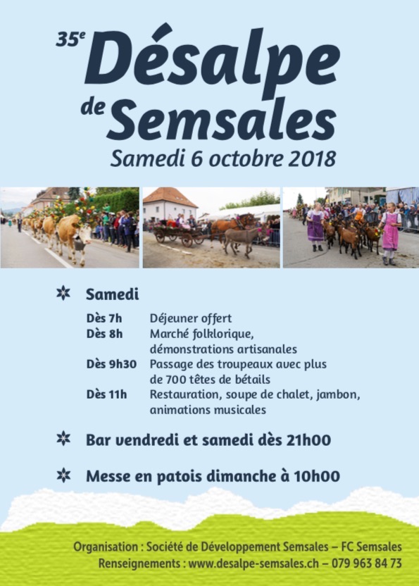 Programme général & horaire de passage des troupeaux Dès 07h00 Petit déjeuner offert 07h30 Ouverture du Marché de la Désalpe 10h00 Troupeau moutons ( Nez noirs du Valais ) 5ème désalpe 10h30 Troupeau de Frédéric Maillard & Daniel Grand 1ère désalpe 11h15 Troupeau de Bernard & Maxime Richoz 21ème désalpe 11h45 Troupeau de Ernest & Florian Seewer 18ème désalpe 12h00 Troupeau de la famille Papaux-Perroud 8ère désalpe 12h45 Troupeau de Chèvres ( Chamoisée du Toggenburg ) 12ème désalpe 13h00 Troupeau de Bernard et Michaël Grand 20ème désalpe 13h30 Troupeau de Martin Mesot 30ème désalpe 13h45 Troupeau de Jean & Christophe Berthoud 28ème désalpe 14h00 Troupeau de Louis & William Berthoud 32ème désalpe 14h30 Troupeau de la famille Demierre, Prayoud 12ème désalpe 15h00 Troupeau de Ruth et Roland Balmat 34ème désalpe 15h15 Troupeau de la famille Bourquenoud 28ème désalpe 15h30 Troupeau de Jean-Claude & Fabrice Favre 30ème désalpe 16h00 Troupeau moutons ( Nez noirs du Valais ) 5ème désalpe Toute la journée : marché artisanal, animations populaires, ambiance de fête 20h30 Remise des prix Désalpe 2017 et Tirage de la Tombola |