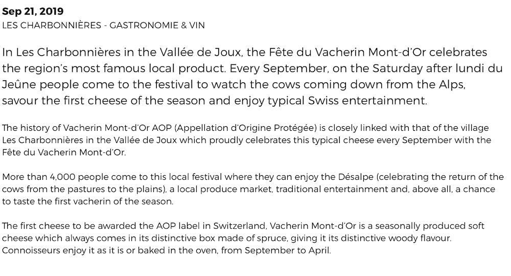 The Vacherin Mont-d’Or AOP cheese will be ready and waiting for you at this particular desalpe festival with many decorated cows. https://www.myvalleedejoux.ch/en/P1284/vacherin-mont-d-or-festival |