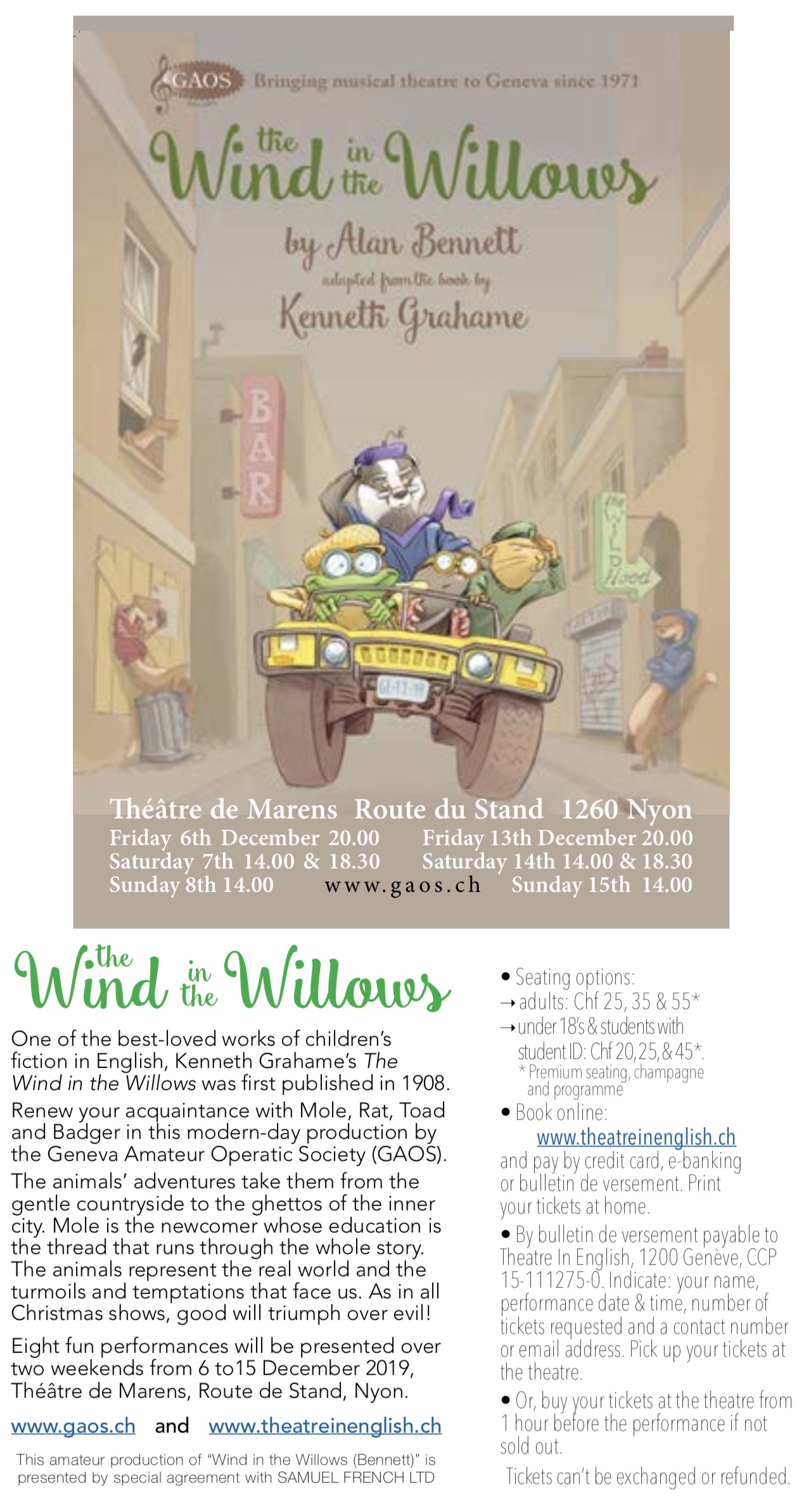 GAOS is proud to present it’s Christmas Show; “The Wind in the Willows” by Kenneth Graham. One of the best-loved works of children's fiction which follows the adventures of Mole, Rat, Badger, Toad, and their friends. Follow the animals on this comical modern-day production, scripted by Alan Bennet, where their adventures and misadventures populate the entire story. From an idyllic riverside picnic to a snowy encounter in the Wild Woods, and from poop-pooping in Toad's shiny new motor car to escaping jail! But watch out for the weasels who plot to take down the protagonists and take over Toad Hall. Will they succeed or does good overcome evil? December 2019: Theatre de Marens, 1260 Nyon Ticket sales open early November through the TheatreinEnglish.ch and GAOS.ch websites. |