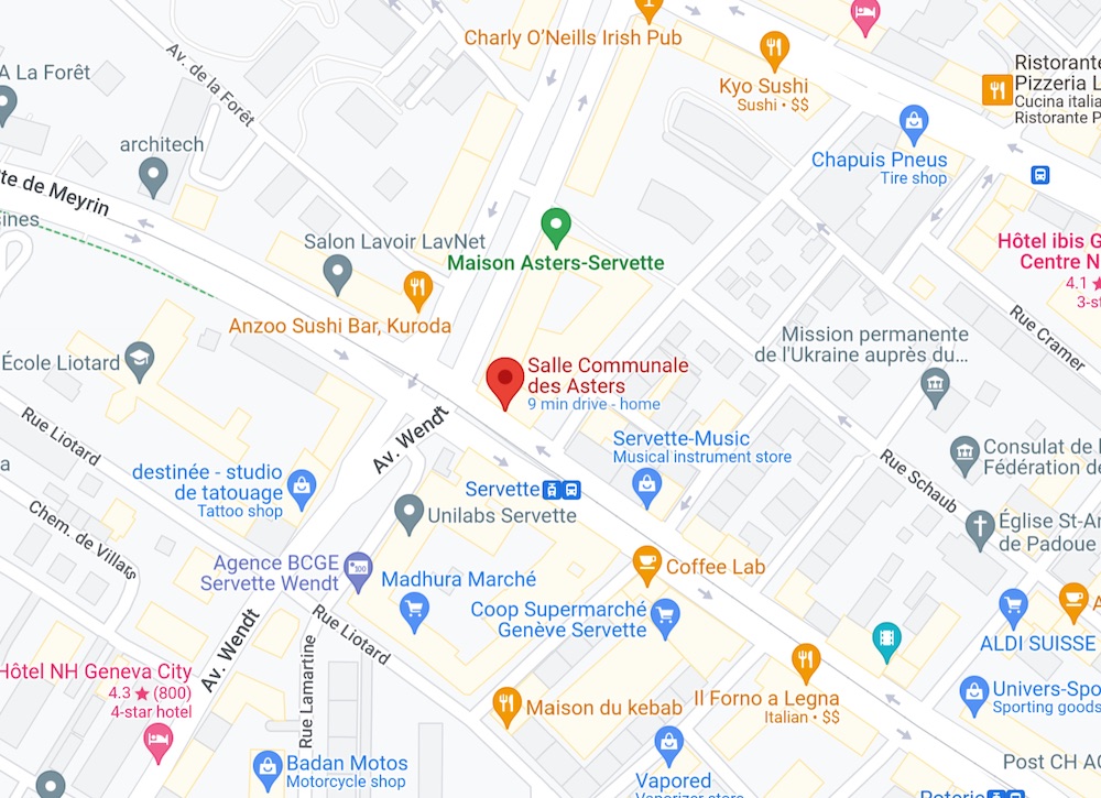 Please note, the venue is still with Maison Aster Servette but due to the on-going renovations, our assigned room at just around the corner (2-min walk) at the Salle Communale des Asters, upper floor (will paste a sign), pls see map/link below.