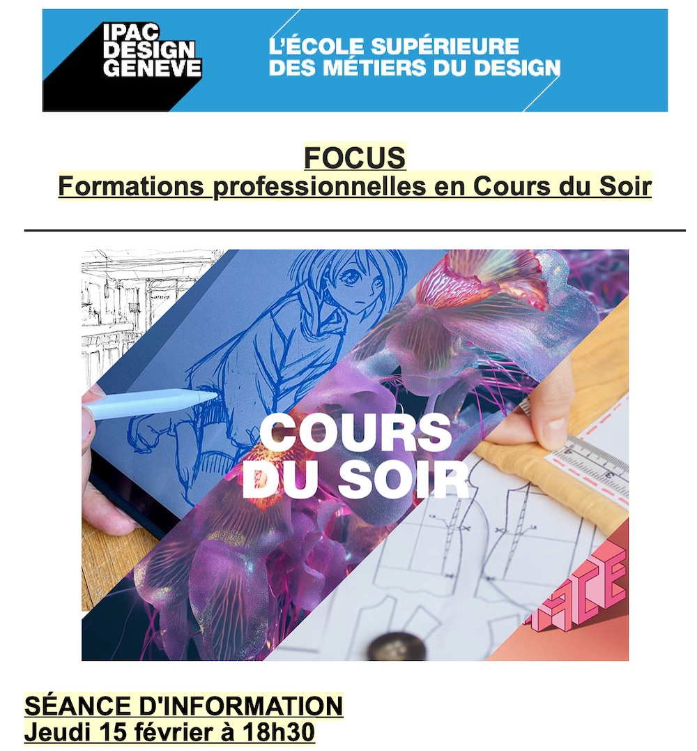 REGISTER FOR THE INFORMATION SESSION Information session: Thursday, 15 February 2024 at 18h30 Take part in the next information evening dedicated to evening courses and find out about the program, what's new and visit the school. Presentation by section directors. SPECIFIC 3-MONTH COURSES LONG COURSES