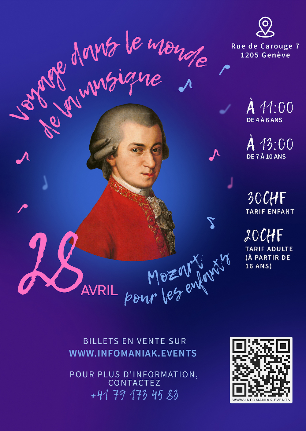 I'd like to contact you about a special event that may be of interest to your young participants and their families. We are organizing a concert as part of the "Journey into the world of music: Mozart for children" cycle, aimed at children aged 4 to 10. These concerts are organized by the Art Mozart Association. This interactive concert will be an educational and entertaining experience for young listeners, enabling them to discover Mozart's emblematic works in an age-appropriate environment. The concert will take place in French on a Sunday, April 28, at the Atelier de la Musique Amadeus, Rue de Carouge 7, 1205 Geneva. We are convinced that this event could enrich your organization's educational program and provide a memorable cultural experience for your young participants. We would like to ask for your collaboration in helping to promote this event to your youth community. We can send you flyers with all the necessary information about the concert by mail, or we can deliver them in person for display on your premises. If you choose the latter option, we would need a contact within your organization who could guide us in placing the flyers visibly. We thank you in advance for your support and cooperation. Please do not hesitate to contact us if you have any questions or wish to discuss this proposal in more detail. Yours sincerely Yulia Daugelaite, Director Association Art Mozart |