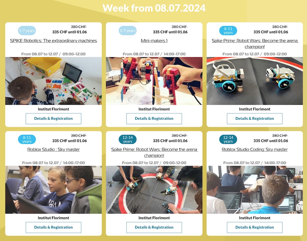 For FutureKids holiday camps at the Lausanne location, click here. https://futurekids.io/activities/holiday-camps?city=Gen%C3%A8ve&online= Held at: Institut Florimont |