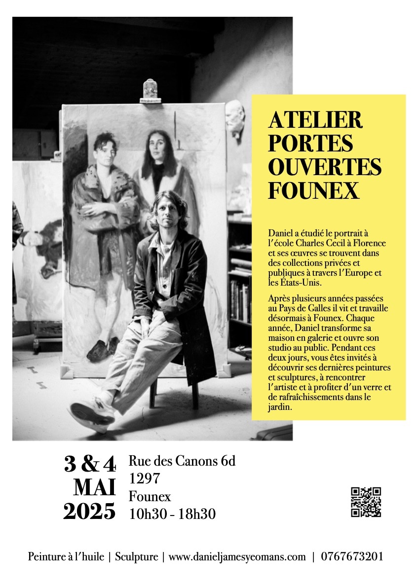 DANIEL J. YEOMANS: ATELIER PORTES OUVERTES FOUNEX 3-4 May 2025 Please come to enjoy a cool drink in the garden and meet with Daniel. You will see his works throughout his home and studio which include oil painting, mixed media, and sculpture. Parking is available in the village car-park, just a hundred meters walk from the house. Daniel J Yeomans RCA is a contemporary painter and self-taught sculptor who studied portraiture at the internationally renowned Charles H. Cecil studios in Florence, In 2019 Daniel’s ‘Self portrait No.3’ was added to the public collection at the National Library of Wales and his painting of Tim was shortlisted for the Jackson’s Art Award. Various portraits have previously been shortlisted by the Royal Society of Portrait painters and in 2021 Daniel was made a member of the Royal Cambrian Academy. As well as specialising in oils Daniel creates thought-provoking installations on varying themes. Coupled with his mastery of painting these creative ideas give Daniel’s exhibitions an immersive aspect and unique style. |