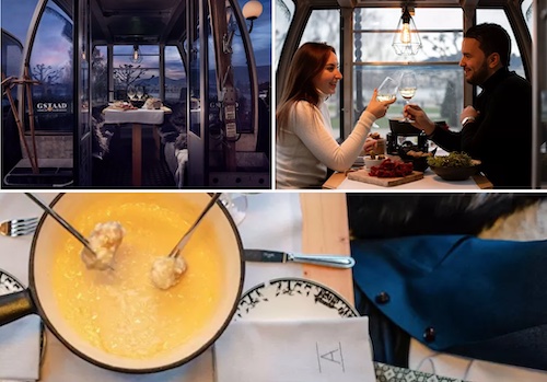 Having a fondue in a ski lift (fixed) with a view of Lake Geneva is not a common occurrence. However, the Beau Rivage hotel pulls out all the stops to make this a reality. Reservations necessary. Choose from à la carte or a menu with viande des Grisons, fondue moitié-moitié, and dessert from CHF 79.-.