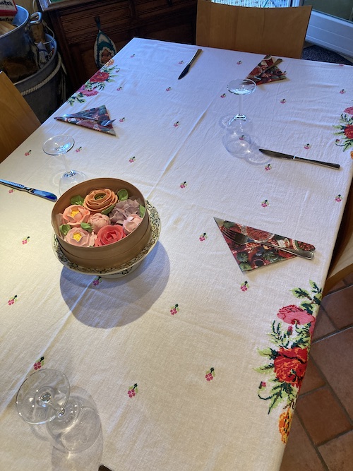 When a listing came up on FaceBook with an amazing photo of soft meringue floral bouquets, I didn't think twice! I wrote to Anna Karpenko from Sweet Blossoms! She replied immediately and sent me amazing photos of the types of bouquets she has already made in the past. I explained I needed at least 7 flowers for a dinner that Friday evening; we agreed that a circular box was great for my table centerpiece. She confirmed CHF 25.- should cover it and we arranged to meet at Cornavin for the exchange the next day (see photo below).