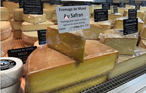 Lisa made a quick overnight trip to visit a high school friend from long ago... The town of Sion, situated in the heart of Valais, is really an amazing city with stunning views from every angle of the beautiful Swiss Alps. The farmer's market has an amazing range of local fruit and veggies to go with your brisolée: a meal consisting of roasted chestnuts served with various side dishes including cheese, dried meats, and autumn fruit. Cheeses bought at the Fromagerie La Grenette (my favorite was infused with saffron from Mund, see photo above), hot chestnuts from the street vendor, viande sêchée, apples, and sliced rainbow beets were our choice!