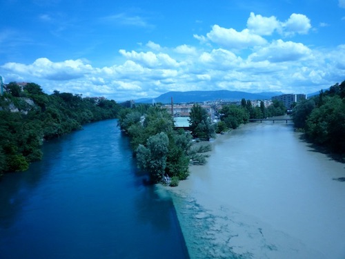 Another 300m or so and you will reach the junction of the Rhône and Arve rivers. You will notice that the Rhône (which is clear blue) is much swifter, and pushes into the Arve (muddy brown) with enough force to cause tiny whirlpools, above which alert ducks hover hoping to catch fish caught in the swirls.