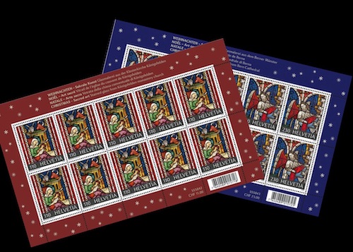 Two magnificent stamps pay tribute to the cultural and historical richness of sacred art in Switzerland. They represent fragments of stained glass windows from the collegiate church in Bern and the convent in Königsfelden. The subject of the 110 centime stamp is a nativity scene from the "Youth of Christ" stained glass window in the monastery church of Königsfelden. This church near Windisch was built for the Habsburg family as a place of remembrance following the assassination of King Albert I. The stained glass windows in the chevet, depicting the birth of Christ, were created just before the building was inaugurated in 1330 and are an expression of the skills of the time.
