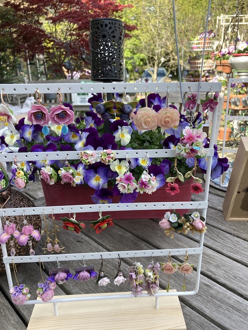 Her cold porcelain jewelry is stunning. Each petal is handmade and assembled. She admits, "As the details are so fine, and the likeness to real flowers is important to me, I have not only had to invest in tiny tools but a good pair of glasses as well!" All the jewelry is one of a kind with earring pairs going for about Fr. 40.- to Fr. 100.-. Simple pieces that don't use the cold porcelaine go for the Fr. 20.- range mark.