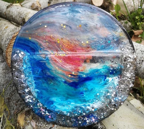If you are not familiar with resin techniques, remember that resin can take up to 24 hours to cure before a second layer is added. Helen usually layers between 4-10 times depending on the art. Prices for the wall art range from Fr. 80.- to Fr. 400.-. Commissions accepted.