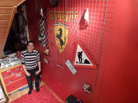 After having a brain-wave about how to display car-related items in my 15-year-old son's room, I went on the search to find one fence panel on which I could hang the items - difficult in the winter. Intensive research, phone calls, and trawling the net, led me to SAMSE in St. Genis, France. Although they wouldn't sell me a single fence panel, they did suggest I buy one of the metal grids that builders use for laying cement as an alternative. Here is my invention for hanging all the car stuff from little "S" hooks from the grid. They can be moved about as necessary. Believe it or not, the 2 units (each measuring 1m x 2m) cost a total of €7.50! The chains are hung from the wooden beam that is at the top of this wall from the screw hooks pictured below (the chains were bought at La Boîte à Outils).