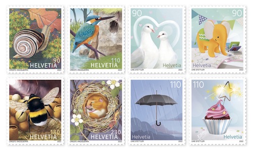 The new stamps from the Swiss Post Office were released a few weeks ago. It is so exciting to see what they have come up with. We love the kiss ones shown above. What fun it would be to use for a party invitation! It doesn't cost anything to order stamps via the website as you pay the face value and postage is free (minimum Fr. 15.- for your order)!